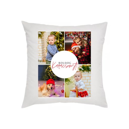 Karácsonyi fényképes párnahuzat-4 képpel, közepén körben felirat